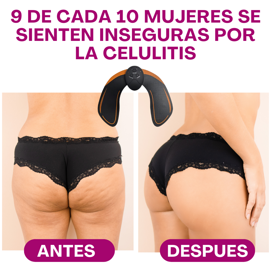 Con la ayuda del TONIFICADOR DE GLÚTEOS, través de pulsos eléctricos activadores, tonifica los músculos, ayuda a quemar grasa localizada y activa la circulación sanguínea, FACILITANDO LA ELIMINACIÓN DE LA CELULITIS.